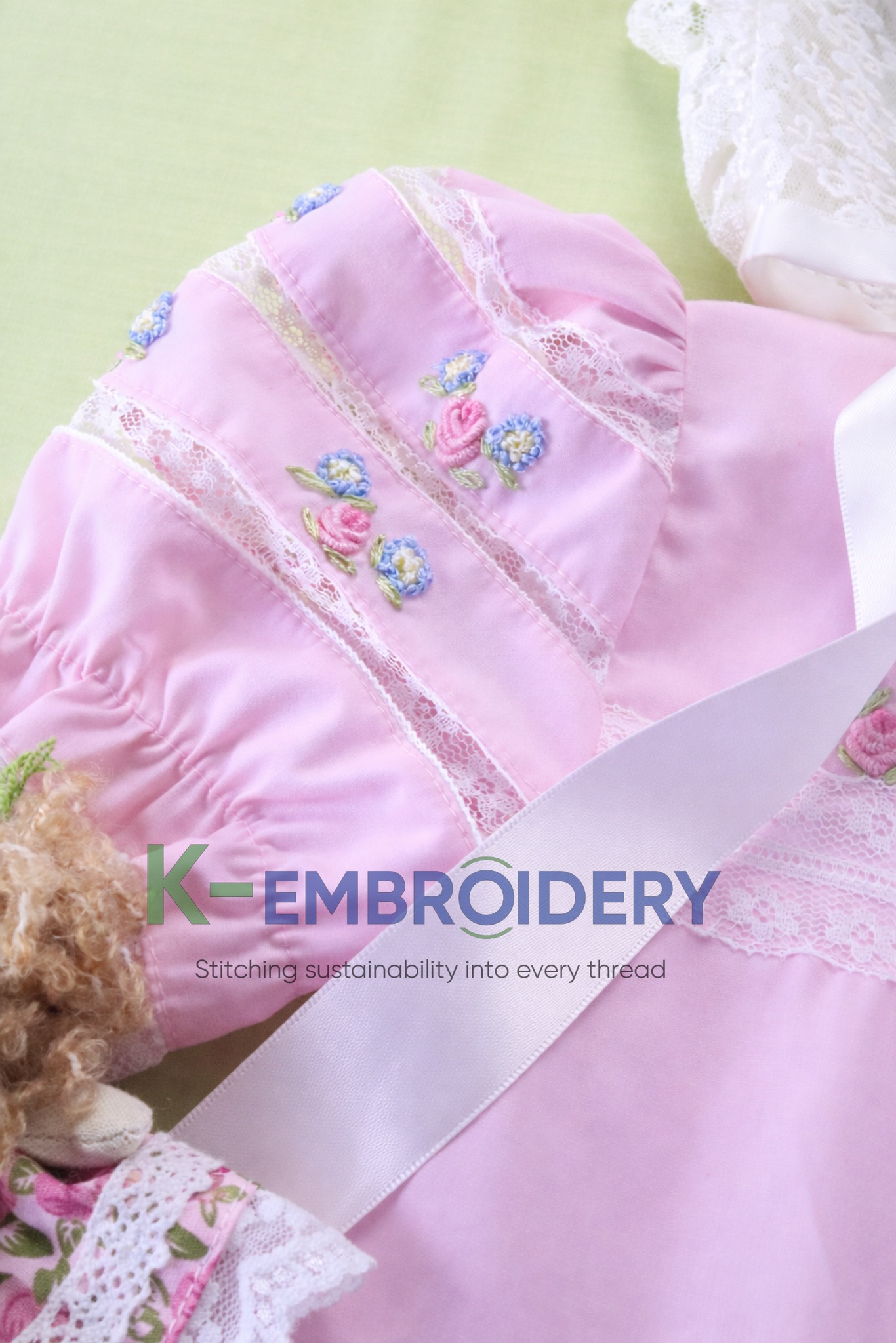 K-Embroidery Vintage Pink Baby Girl Dress with Lace & Floral Hand Embroidery